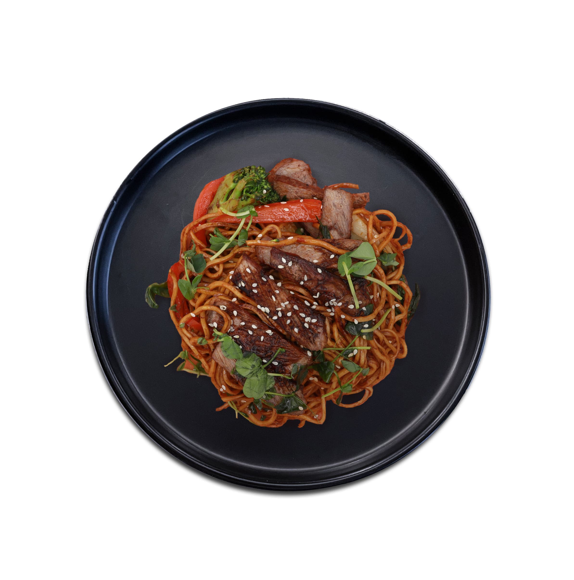 Prime Rib Steak, Garlic, Ginger, Green onion, Sriracha, Soy sauce (gluten free), Honey, Rice Vinegar, Sesame oil, Bok Choy, Red Bell Pepper, Chow Mein Noodles, Broccoli